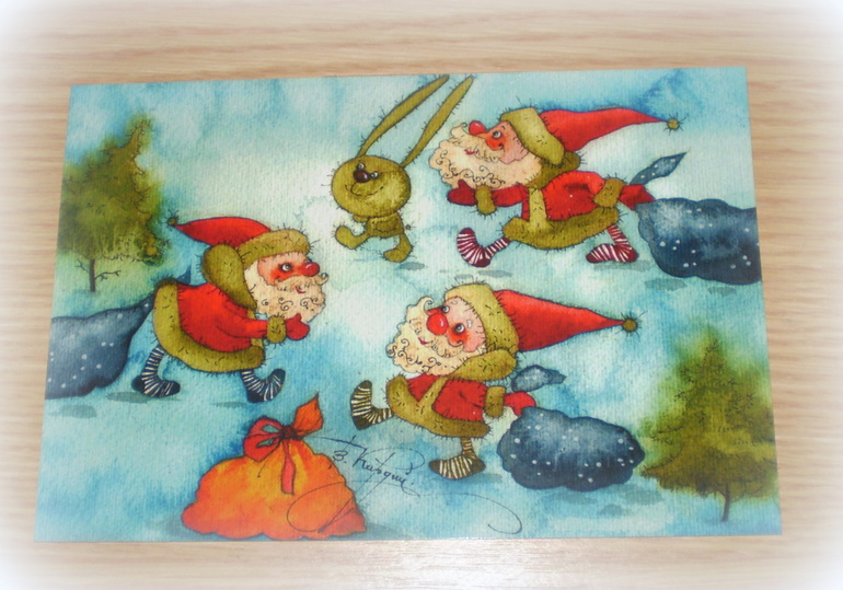 Вот откуда всё началось: такую милейшую новогоднюю открытку первым делом увидела я , открыв посылочку. Наташенька, спасибо за добрые пожелания!!! Очень приятно)))
