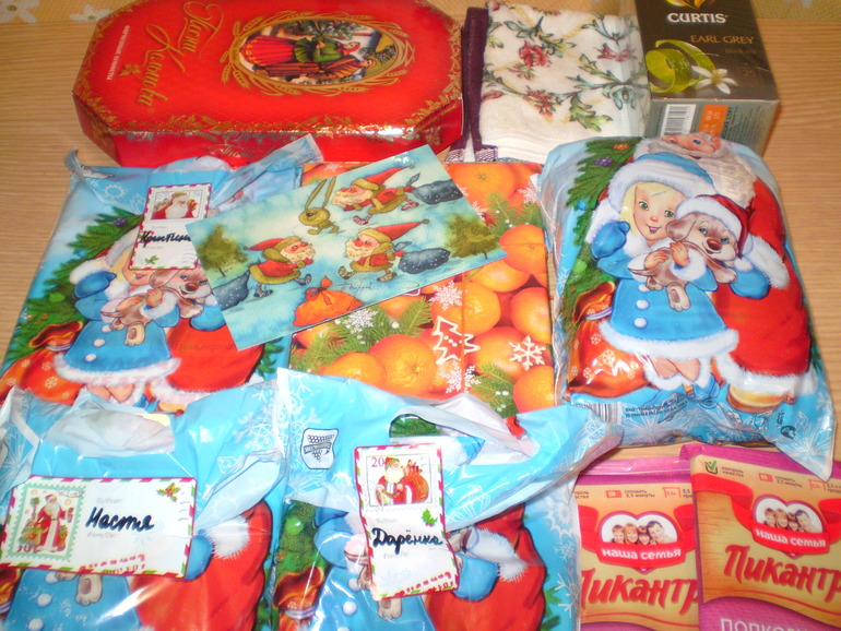 Все подарочки были упакованы с такой душой и внимательностью... каждому члену семьи в отдельном подарочном пакете с подарочной надписью... всё это было проложено новогодней мишурой... в общем, настоящий Новый год приехал к нам досрочно с твоей посылочкой, Наташа