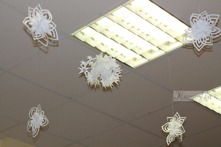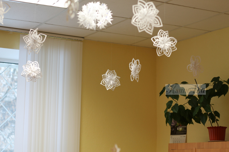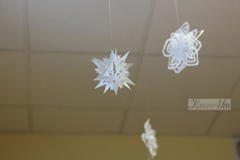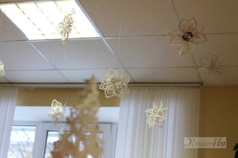 Ну, и наконец, главные вдохновительницы этого года - объёмные снежинки! Как мне понравилось их делать! Какой простор для фантазии!!! Я сделала больше 20-ти штук, повесила на мононить. Все разные, неповторимые! Теперь с удовольствием наблюдаю за их волшебным изящным танцем!