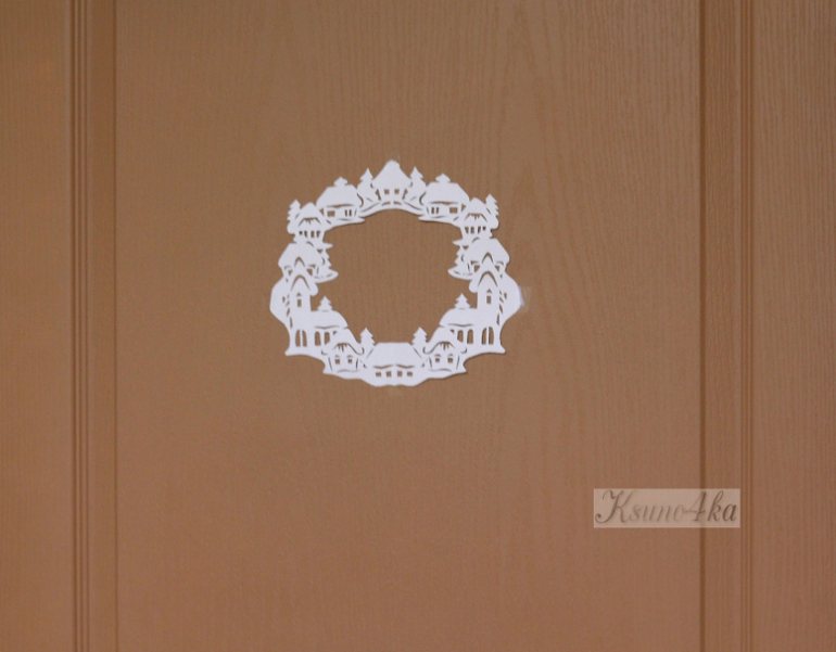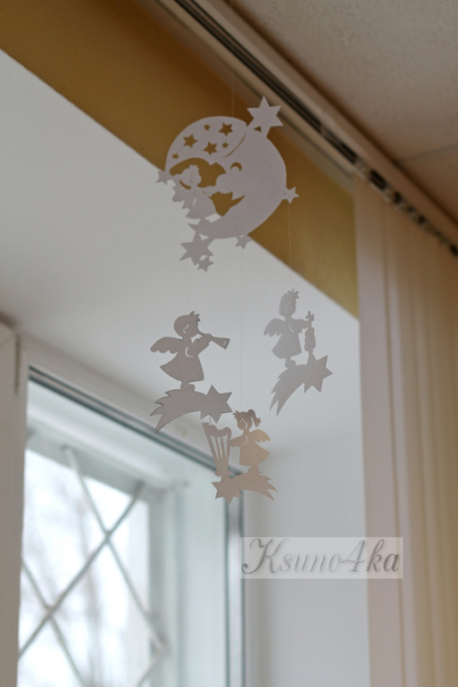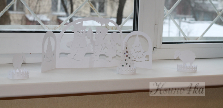 На подоконнике расположилась эта композиция, дополненная овечками и милой ёлочкой, на которую наклеила сверкающие пайетки. Все картинки вырезала канцелярским ножом.