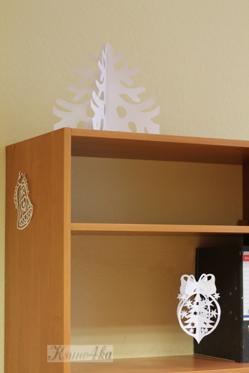 Шкафы симметрично украшены другими колокольчиками, а также объёмными ёлочками.