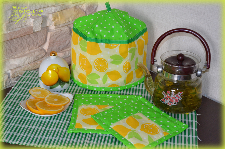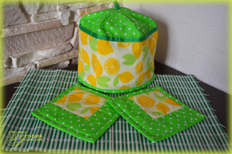 В комплектик к грелочке сшила две прихваточки, размером 15х15см. Наборчик сшит из американского и беларусского хлопка, внутри утеплён флисом, грелочка в один слой, прихватки в два, швы отстрочены декоративной строчкой.