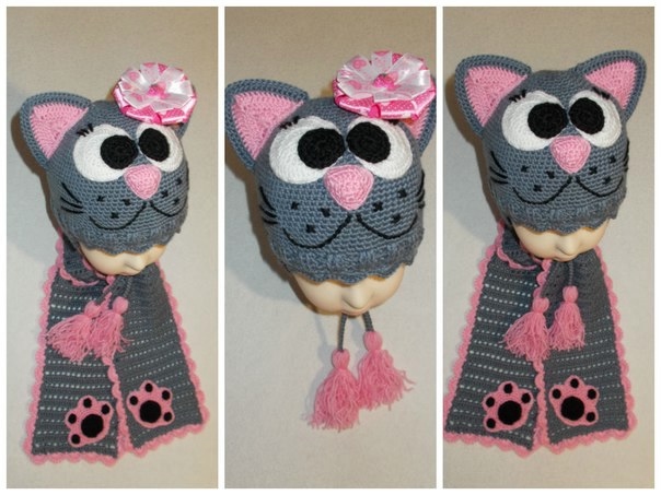 Комплект "Кошечка",шапочка о. г 48, шарф 12,5*107 см. нитки Пряжа Ализе Беби Вул (шапка в 2 нити +флисовый подклад, шарф в одну).