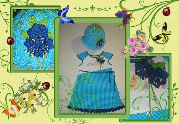 Комплект"Колокольчик".Для панамки нитки Розе, Анна 14, платье вязать не успевала, купила готовое и просто обвязала низ и связала украшение-колокольчики.