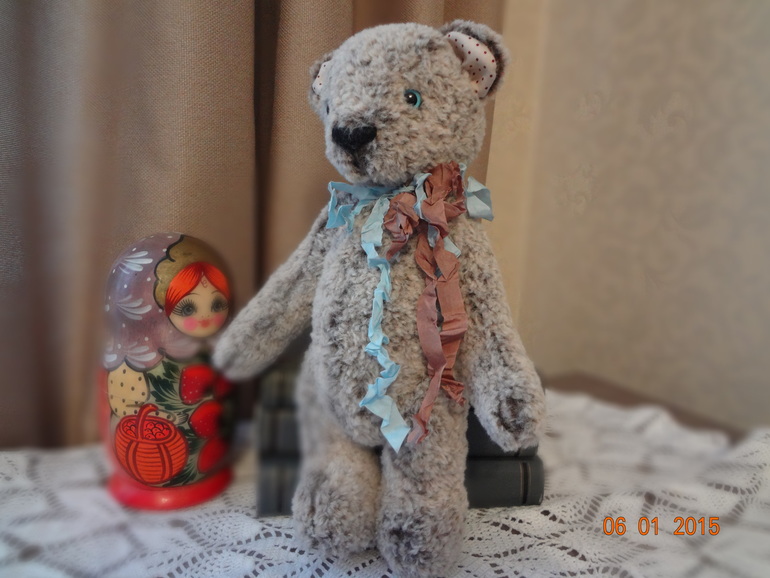 Игрушечный мир - животныеМишка сшит из искусственного меха,набит плотно синтепухом,утяжелен гранулятом. Голова на шплинтовом креплении,ручки и ножки на пуговичном. Украшен мишка шебби лентами. Мишка такой мягенький на ощупь,приятно держать в руках)))