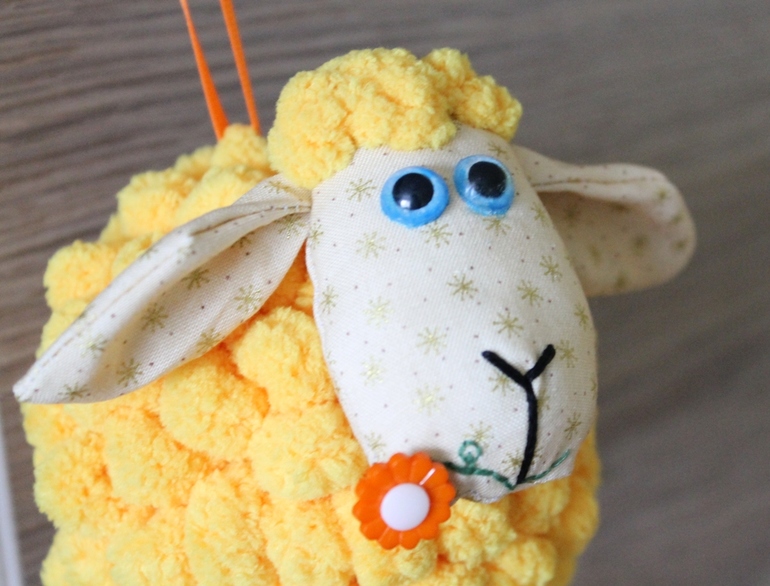 НО, тк я не очень люблю шить (потому что у меня не всегда получается так, как я хочу) и чтобы не испортить овечку, я решила упросить процесс создания тела овечки и сделала так - взяла шарик для сухого бассейна. Проделав в нем небольшое отверстие, набила его бумагой (можно газетой, салфетками), затем обклеила кусочками газеты при помощи клея ПВА, дала высохнуть (все это делала для того, чтобы шарик был более жестким, чтобы не прогибался при любом нажатии на него)). В мк Татьяны шарик сделан из флиса и синтепона ) Затем я не стала прошивать пряжу (как в мк) я просто взяла горячий клей и приклеила помпончики к шарику) Делается это очень быстро ) мордочку и уши я делала по выкройкам Татьяны. С ножками опять вышел казус (а все мое "умение" шить)) - заменила я их резинкой и бусинками (а можно было сделать как в мк Татьяны по маленькой овечке - из помпончиков) Когда я делала овечку я совершенно забыла, что у маленьких овечек сделаны ножки с помпончиками ( но и с бусинками тоже ничего ))))