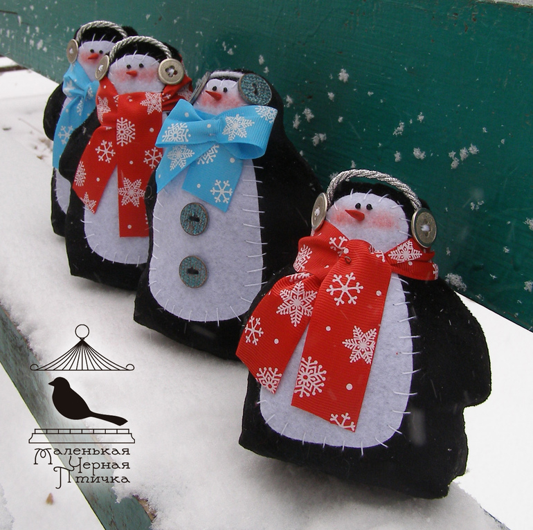 Вот такие милашки получились. Делала носы для снеговиков, ленточек нагребла неизвестно куда, пуговок также. Бархат - уже несколько лет хожу вокруг него кругам и думаю: вот сейчас все доделаю что планировала и сделаю милоту какую-то. И БАЦ. увидела выкройку тильдовских пингвинов. такие игрушки самые любимые у меня получаются, которые случайно собрались, а не специально планировались.