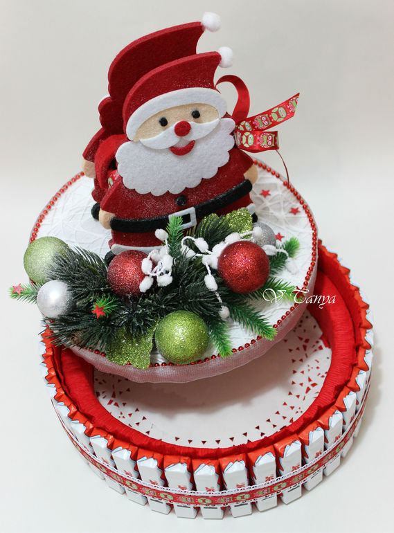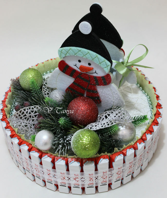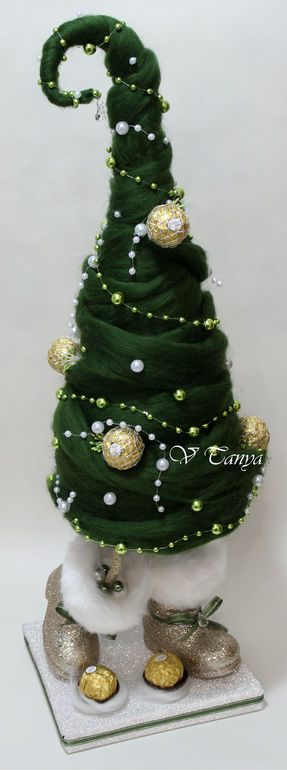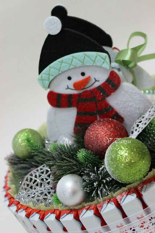 Спасибо, Наташа! Не видела твою елочку... покажи? Дед мороз и снеговик — это сумочки из войлока. Ручка свернута и в них запрятана. Они не приклеены, а на ленте — отвяжи и играйся.