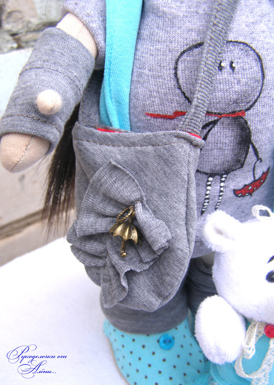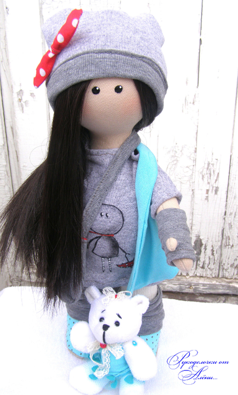 Наконец дошли мои ручки до шитья этой куколки. Первый раз такую девочку шила...очень понравилось...были конечно сложности)). Ростиком около 35см. Одёжка съёмная вся. Трессы один в один мой родной цвет)). Обувку шила сама...благодаря им девочка прекрасно уверенно стоит. Принт на тунике нарисовала красками по ткани. Смотрю на неё ...есть что-то от меня в юности))). Мишку тоже очень полюбилось шить...на пуговичном креплении малышка-мишка ростиком 11см....лапоньки все двигаются. Вообщем отдохнула моя душенька на создании этой девочки). Имени пока нет..думаю будущая хозяйка даст ей чудесное имя). Пока фотографировала..пошёл снежок...поэтому без шапочки не получилось нормально доснять).