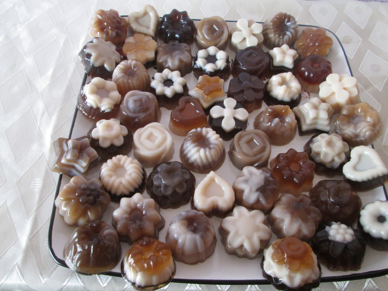 Заказ для свадьбы - 50 мылок-шоколадных конфет (будут раздавать гостям в качестве сувениров такие мешочки с монеткой и мылом). Три вида "шоколада", ароматы - шоколад, кофе, миндаль, вишня в шоколаде. Пахнут на всю квартиру!