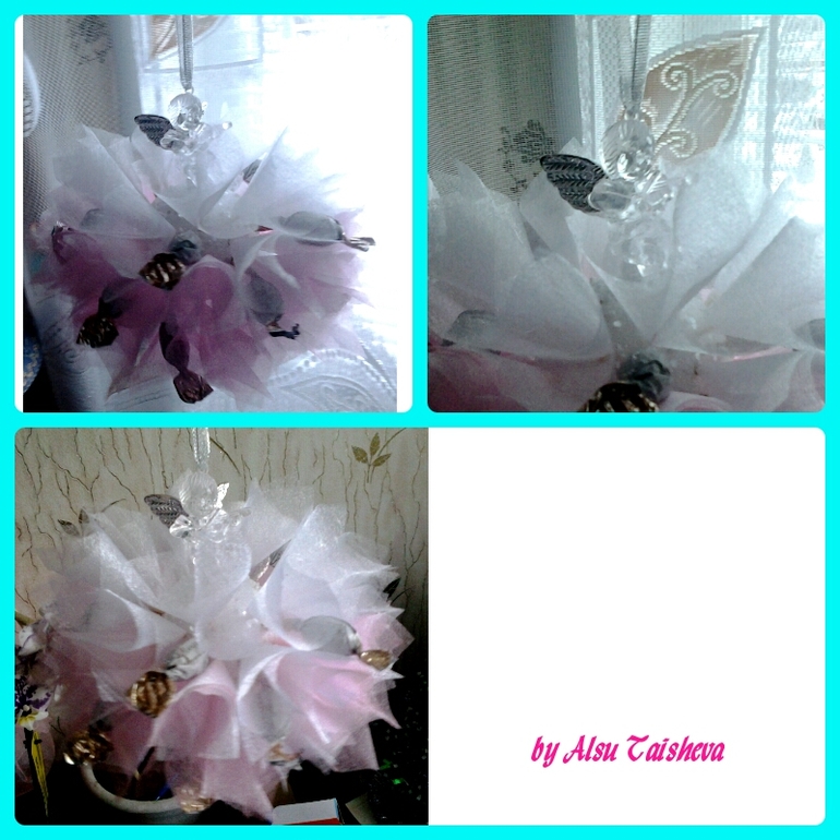 Милые свит-дизайнерши! Разрешите представить на ваш суд очередной сладкий подарок! Задумывался плотненький шарик со множеством конфеток. Брала аж 2 упаковки по 200гр, но мои сладкоежки все подъели(( конфет хватило только на 2 ряда. С органзой тоже получился ляп, не хватило, а докупить негде было( поэтому фунтиков тоже жидковато. Подарила подружке в качестве рождественского подарочка. Она порадовалась такому сюрпризику!