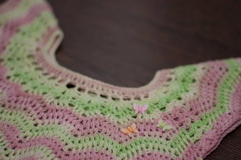 Перевязывала с пройм 2 раза, т. к. сильно пышное получалось, но таки я его закончила.