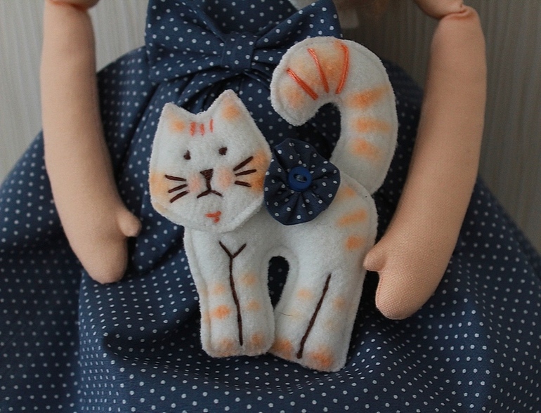 Представляю вашему вниманию очередной, выполненный мной заказ. Работать над ним было невероятно интересно и приятно. Куколка обладает портретным сходством, насколько это возможно воплотить в формате тильды. В качестве аксессуара к ней был пошит котик по кличке Анчоус ( девочка для которой выполнялся этот заказ, большая любительница котиков). Но кот имеет еще одну "секретную" функцию, сзади к нему пришита застежка и его можно использовать в качестве броши. Вот такая работа получилась. Материалы: немецкий хлопок, бязь, поплин, трикотажное полотно, фатин, шерсть для валяния, нитки мулине. Наполнитель: полиэфирный пух.