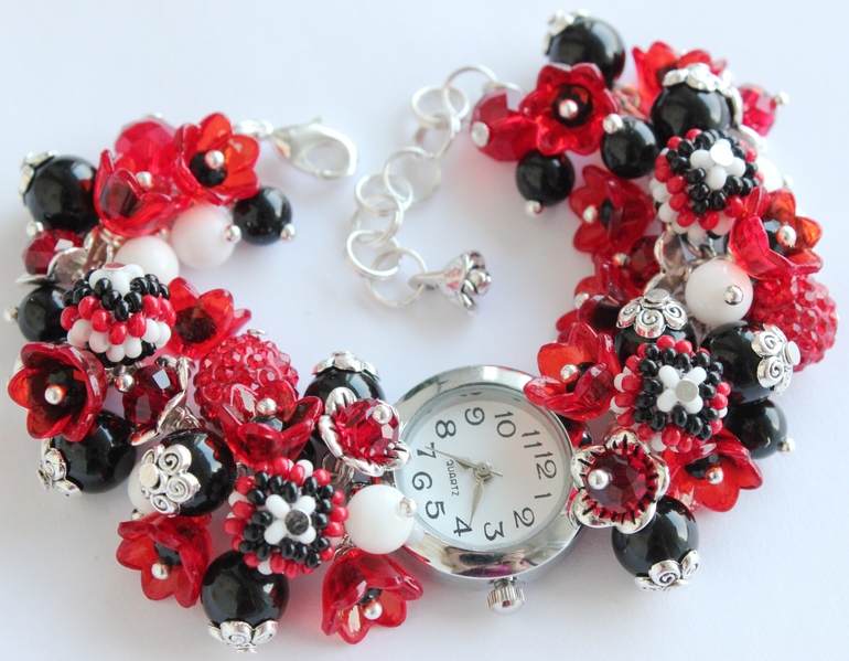 4) Часы выполнены из бусин, оплетённых чешским бисером, кварцевых часов(на батарейке), агата, акриловых цветков, гранёных бусин и фурнитуры под серебро.