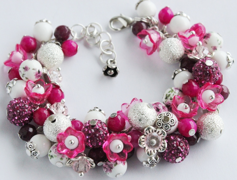 5) Браслет выполнен из агата, бусин из страз, акриловых цветков,керамических бусин, гранёных бусин и фурнитуры под серебро.