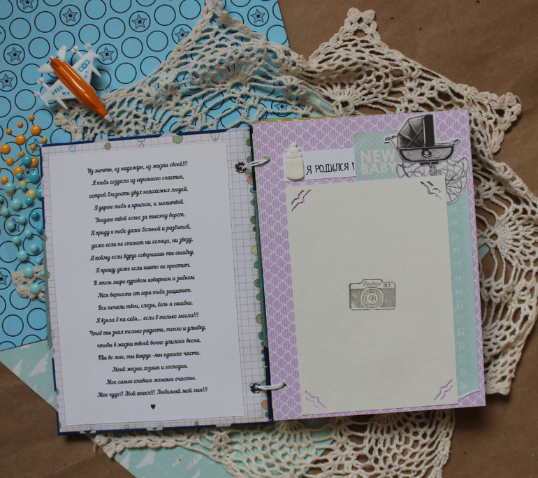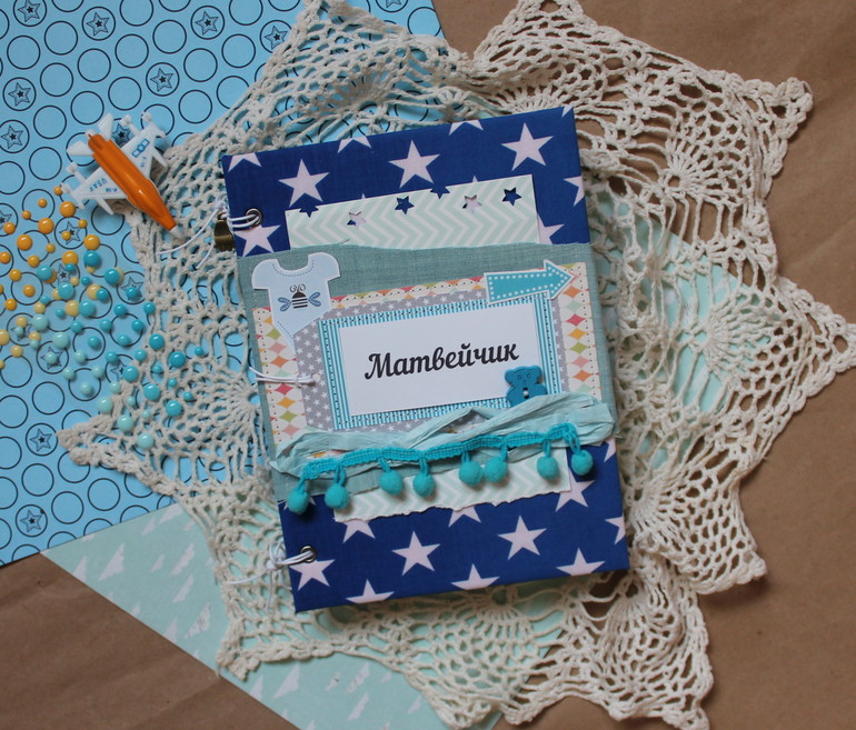 Покажу сегодня очередной детский заказ -для малыша Матвея. Звездный блокното -альбом,пухленький и тяжеленький.:) Включает в себя разделители с местом для 21 фото фото малыша , 8 карточек для записи важной информации/достижений,конверт для хранения важных заметок или вещей ,например бирочки с роддома .На форзаце мамочка попросила поместить красивое стихотворение про сыночка.