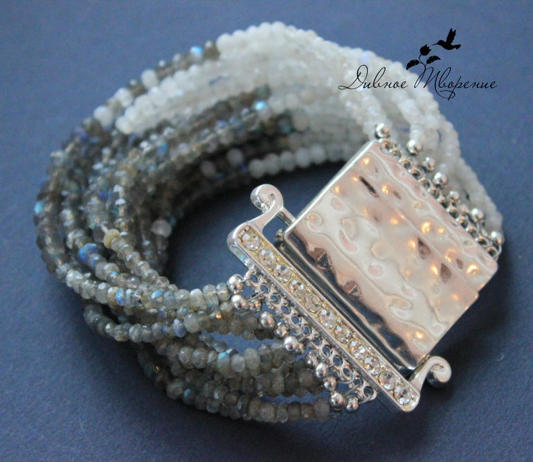 Повтор моего любимого браслета "Ночной туман",к нему и делались серьги.Все камушки и лунный камень,и лабрадорит, с огранкой,поэтому блеск у браслета получился невероятным!!