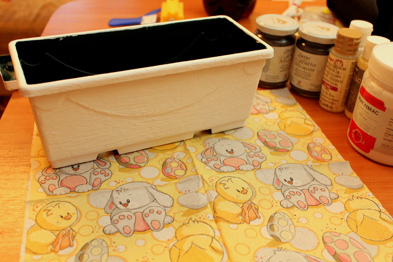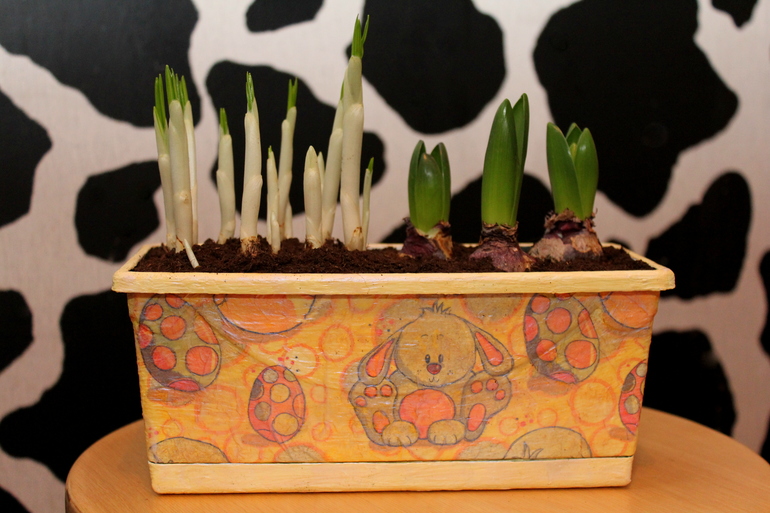 ДекупажВчера убрали елочку и захотелось уже весны, купили крокусы и гиацинты. Захотелось им не просто горшочки, а что-нибудь длинное и прямоугольное. К сожалению горшков и кашпо красивых такой формы не нашлось, пришлось брать что было и декорировать. Исходник качества ужасного и очень не нравится рисунок на нем, но искать что-то другое уже не было времени.