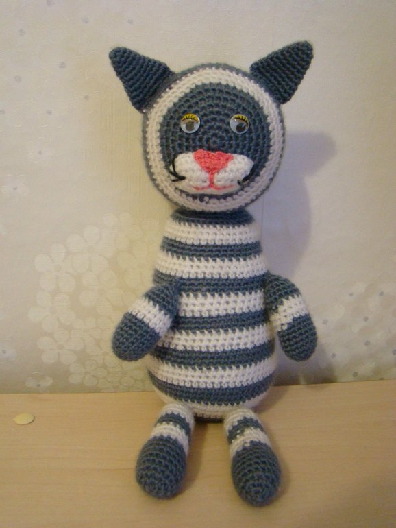 Для первого раза самое то! Красивый.Но в следующий раз надо уши делать одинаковыми, ручки пришивать ровнее ( мне помогает сначала приколоть части булавками а потом по ним же пришивать) и швы сзади прятать.Не обижайтесь. Мне очень кот понравился. Просто видно что еще мало опыта в вязании игрушек. Зато ребенок будет пищать от удовольствия.
