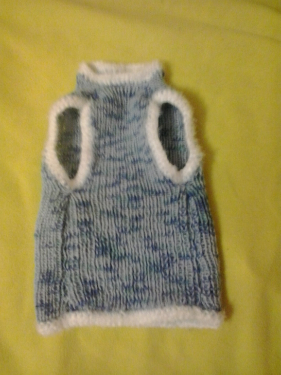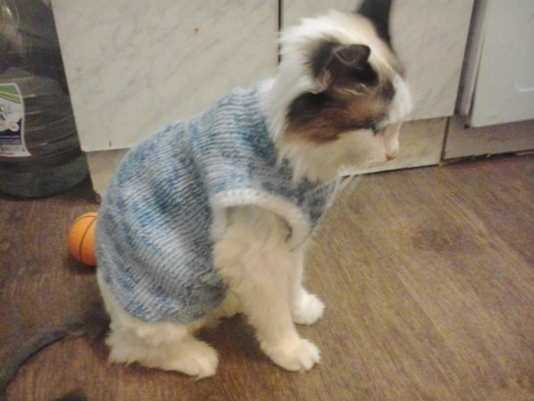 Конечно из-за того, что надо было спасать кошку от холодов, и от стыда, вязала быстро и не старалась, получилось не ахти, но для дома я думаю в самый раз (и стрижку ужасную скрывает, и тепло)!