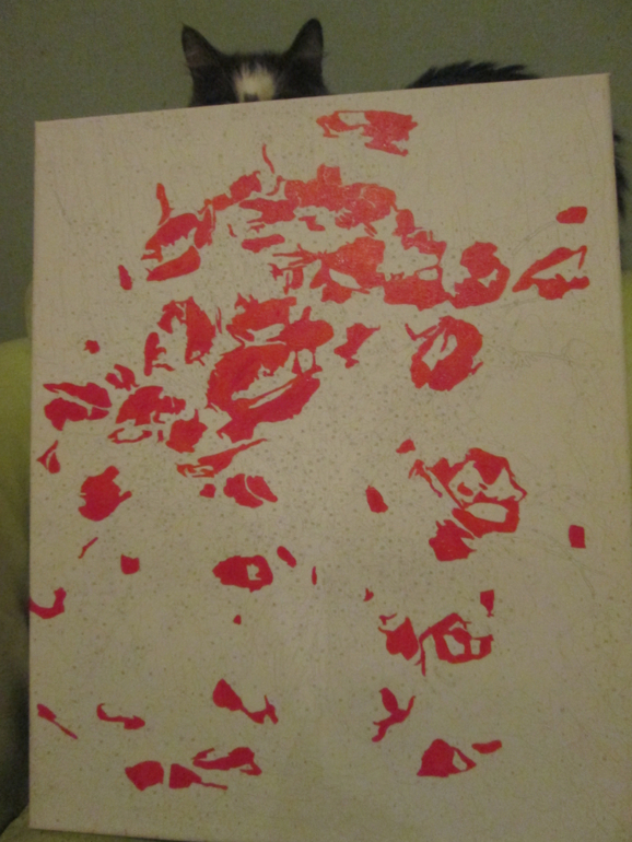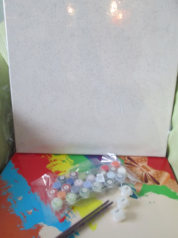 Изначально выглядит это так: холст, акриловые краски, 3 кисти разных размеров и 3 баночки лака (так я и не поняла зачем они нужны) ((