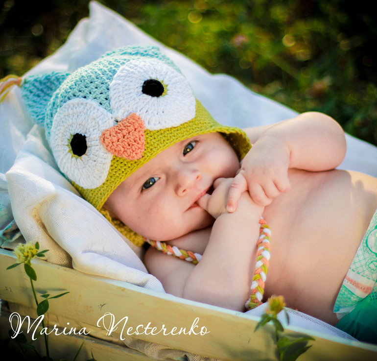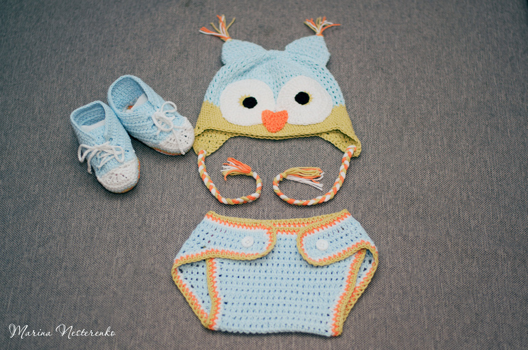 Давно связала шапочку-сову для фотосессий, и все мне казалось что чего-то не хватает, и я решила довязать еще напопник и пинетки