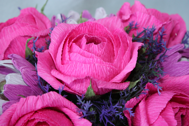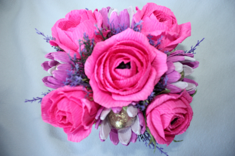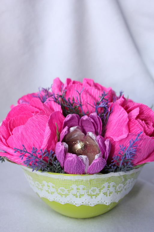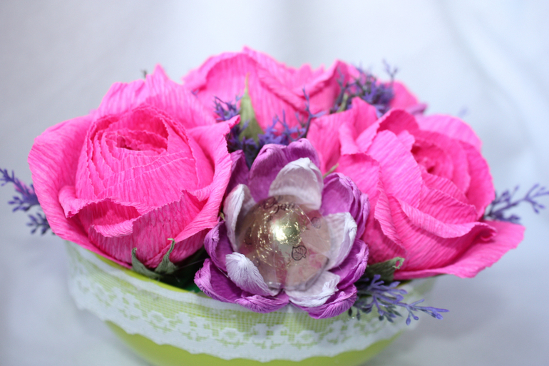 Мария, добрый день!! Из (+) розы не плохо вышли, цвета сочетаются(именно гофры). (-) больше на данный момент. Во первых, Ваш, видимо, салатник лучше использовать по прямому назначению, но если Вы уж взялись его использовать для иных целей, то надо было максимально связать два звена композиции, больше салатового в цветы, нету зелени, значит салатовую гофру (можно почки делать из нее) или даже салатовые ленты. Кружево по краю лучше совсем убрать, оно тоже не совсем верно подобрано, на мой взгляд, слишком простовато смотрится, да и вообще не нужно оно здесь. Ракурс сверху показывает ошибки в посадке, явно квадратно смотрится. Я вообще симметрию не люблю, лучше в продуманном беспорядке цветы сажать. Ну и деталек бы побольше, шарики из ротанга, бабочки, жучки, ну про зелень уже написала. Без обид, пишу, что вижу.