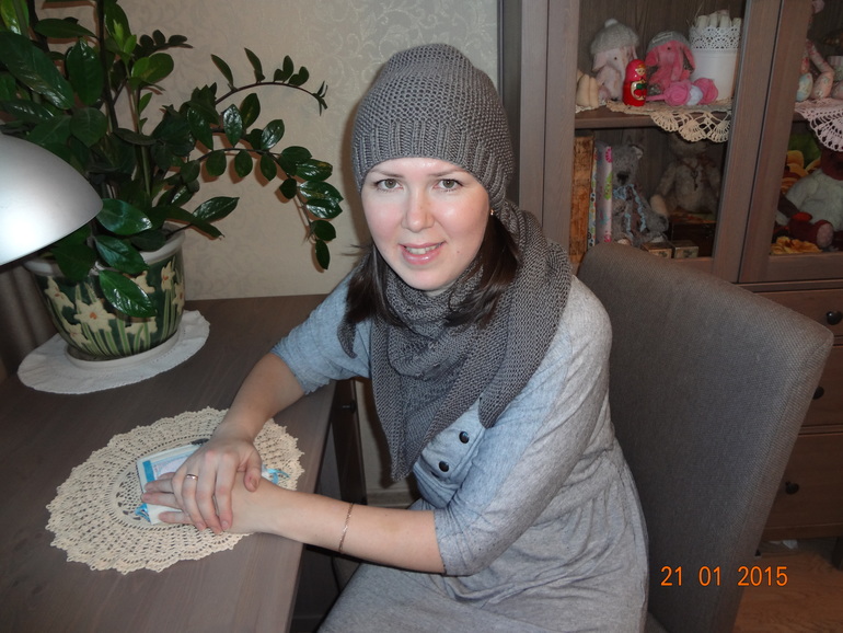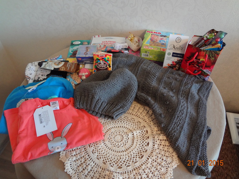 с обменом,и вот сегодня мы получили от нее огромную коробку подарков!!! На столе все еле уместилось,а детям не терпелось получить свои подарки,нам все очень понравилось и я и детишки остались довольны!!! Обо всем по порядку...Договаривались изначально на шапку и шаль для меня и салфетку)) Шапка идеально подошла мне по цвету и по размеру,она такая теплая))) аккуратно выполнено,очень она мне понравилась завтра обязательно обновлю и шаль такая теплая и красивая,не передать словами....фото на мне,кому интересно прошу под кат..