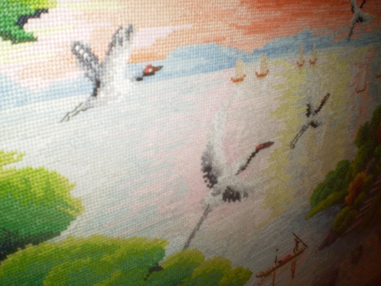 Наконец-то закончила вышивать китайский набор! Вышивалось с удовольствием. Проблемы были в багетке - не везде хотели браться за оформление, но потом когда нашли мастерскую было выяснено, что в нашу ЛАДУ картина ну никак не хотела вмещаться (вместе с багетом размеры 177 см на 90 см). Пришлось просить друзей с машиной ... подлиннее. :)