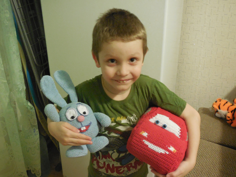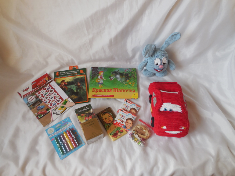 Подарочки оказались просто чудесными! Уговор был только на Кроша для дочи, но Надя не обошла внимание и сыночка и связала Молнию Маквина! А также нас ожидали сладости,чай, книжка и наклейки для детей, маркеры для ванной ( сын весь вечер рвался купаться, но из-за прививки было нельзя), пуговки и ленточки для меня. Вот они наши богатства.
