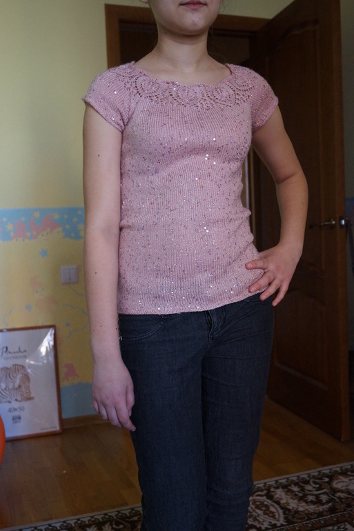 Очень красивый и сидит отлично! Давно заглядываюсь на эту пряжу, но смущают пайетки — они не колются? А каким № спиц вязали?