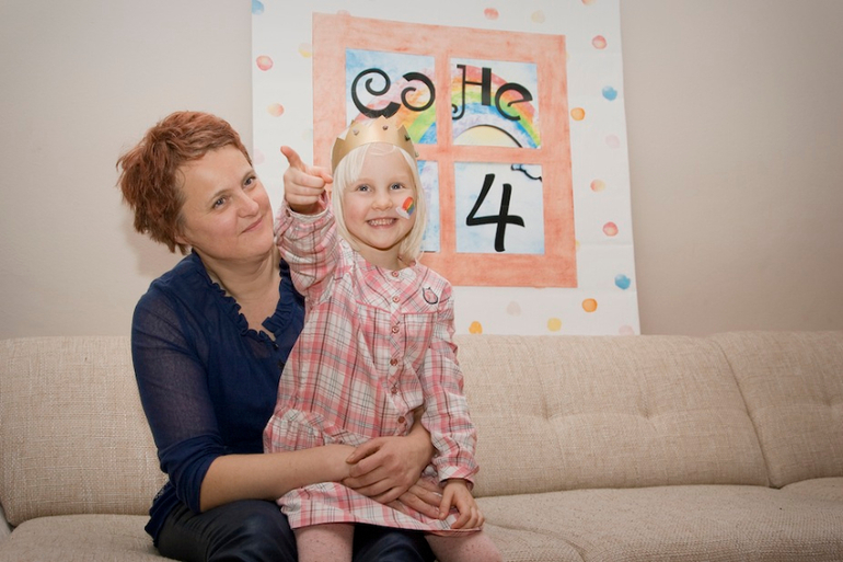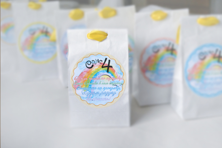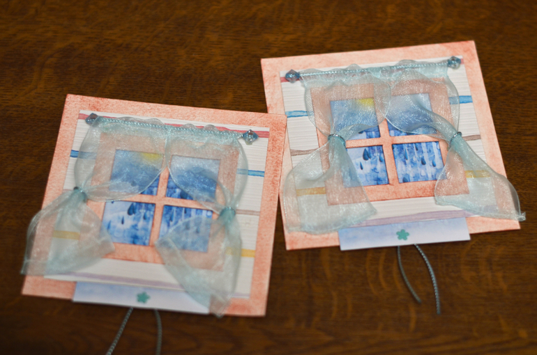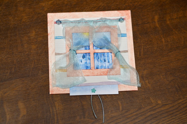 Вкладыш с дождиком вытягивается за прикрепленную брадсом проволоку, на нем и написано само приглашение, а за окошком, как видно, появилась радуга с надписью Соне 4.
