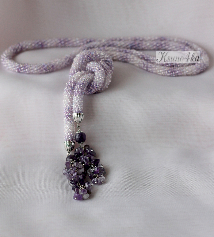 Лариат "Аметистовые грозди" выполнен из чешского прозрачного бисера с радужным покрытием, гранёных бусин и крошки аметиста, фурнитуры под серебро, хлопковой меланжевой пряжи.
