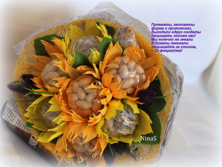 Правильно надеешься! Я уже делала несколько подобных букетов, только ни разу не получилось нормально снять, что бы выложить фото! в него еще можно носочки добавить, семечки, арахис или сухарики!
