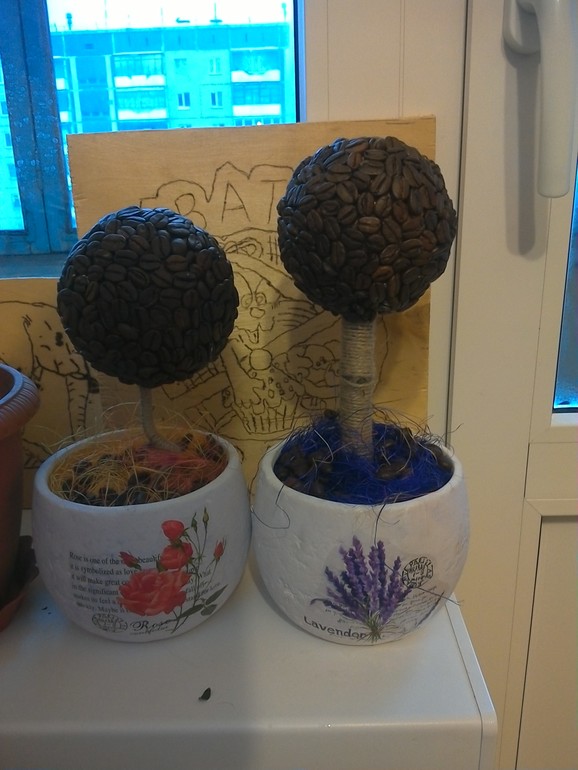 До конца конечно еще не оформили (нечем было), но получилось по моему мило для первого раза. Одно дерево делал Денис (в фиолетовом горшке), а второе я. А запах в квартире стоит, приятный, кофейный, просто прелесть