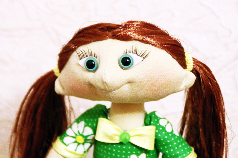 Очень трудно мне дался образ. Волосики пробовала и из шерсти и спец. кукольные кудряшки....но все таки остановилась на "атласных " волосиках Минус этой выкройки-то, что головной убор какой то трудно одеть....Но я вроде справилась с оформлением)))