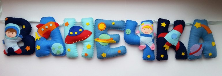 ФетрМне давно хотелось сшить "космическое" имя. И я давно решила, что сошью его именно для этого мальчика. И мне хотелось сшить самый длинный вариант имени, чтобы вошло побольше всяких космических штучек. Ну а раз у этого мальчика есть сестрёнка, к космонавту-мальчику обязательно нужно было добавить космонавта-девочку.