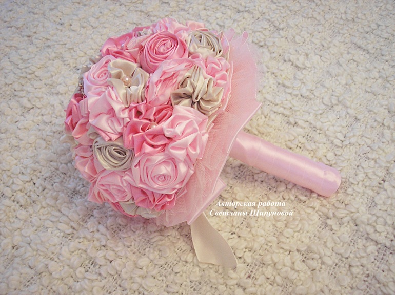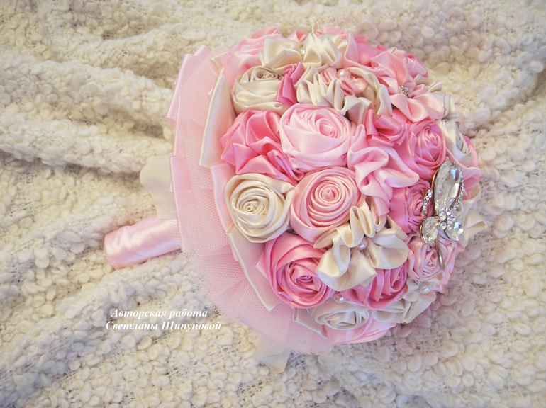 Невероятно нежный букет цветов из атласных лент, каждая розочка сплетена с любовью) Как я мечтала его сделать!)