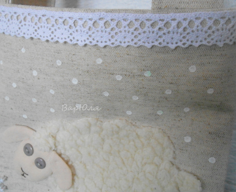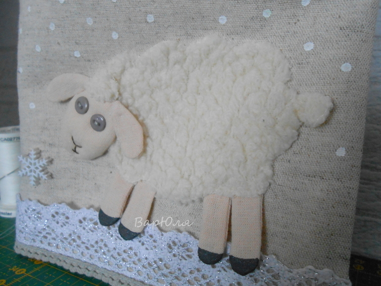Аппликацию делали из кусочков меха, купленных мною ещё в канун Нового года, хлопка, пластиковых пуговичек. Копытца и падающий снег рисовали акриловыми красками по ткани.