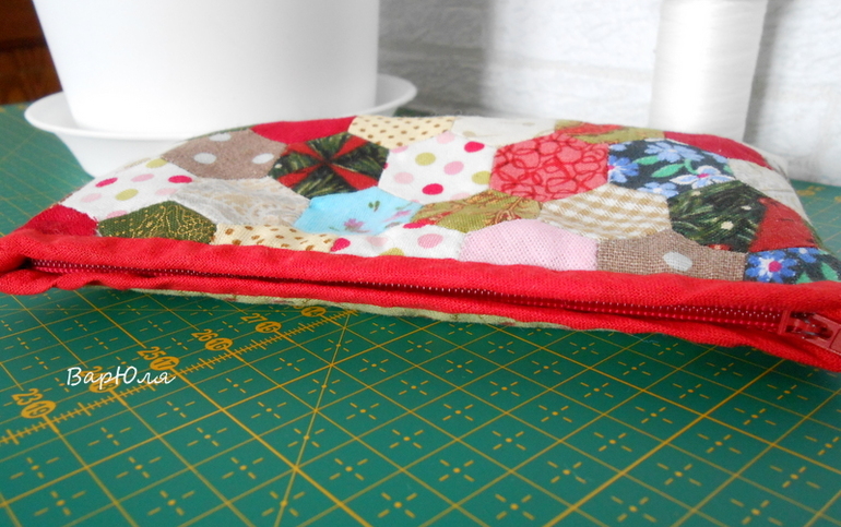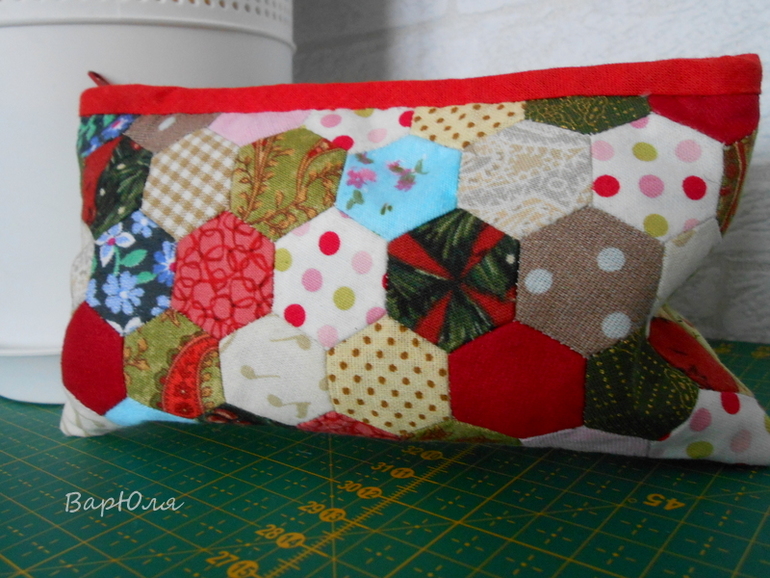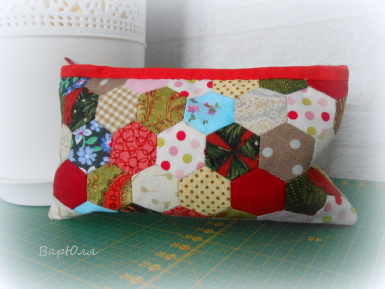 Шила в английской технике пэчворка ( т. е. по бумажным шаблонам). Сторона шестиугольника 1.5 см.