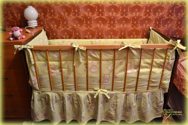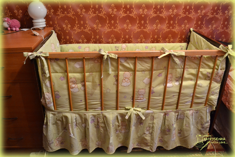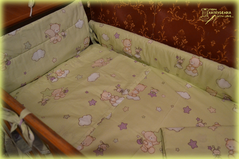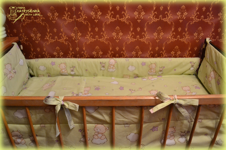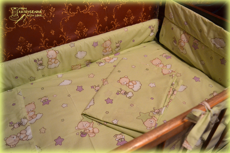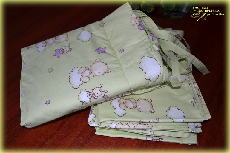 В комплект входит: простынка 1,6х1,0, пододеяльник на детское одеяльце 1,1х1,4, наволочка 0,55х0,35, бортики 0,4х1,2 и 0,4х0,6 (проложены силиконом для мягкости) и рюшечка по низу 0,4м. Хочу ещё под размер наволочки сшить подушечку и набить холофайбером (у малышки есть специальная артопедическая подушечка, а эта будет для красоты или, когда малышка подрастёт найдётся ей применение).
