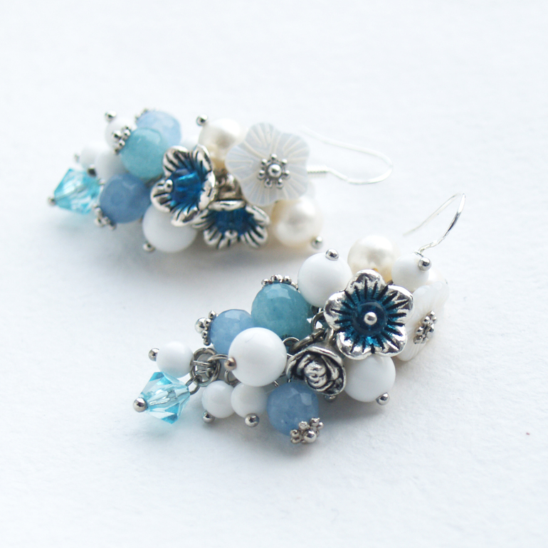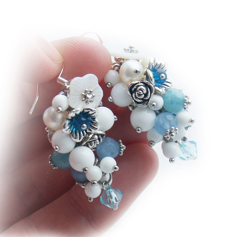 Аккуратные и очень милые серьги-грозди. Использованы бусины агата, жемчуга, перламутровые цветы, металлофурнитура.
