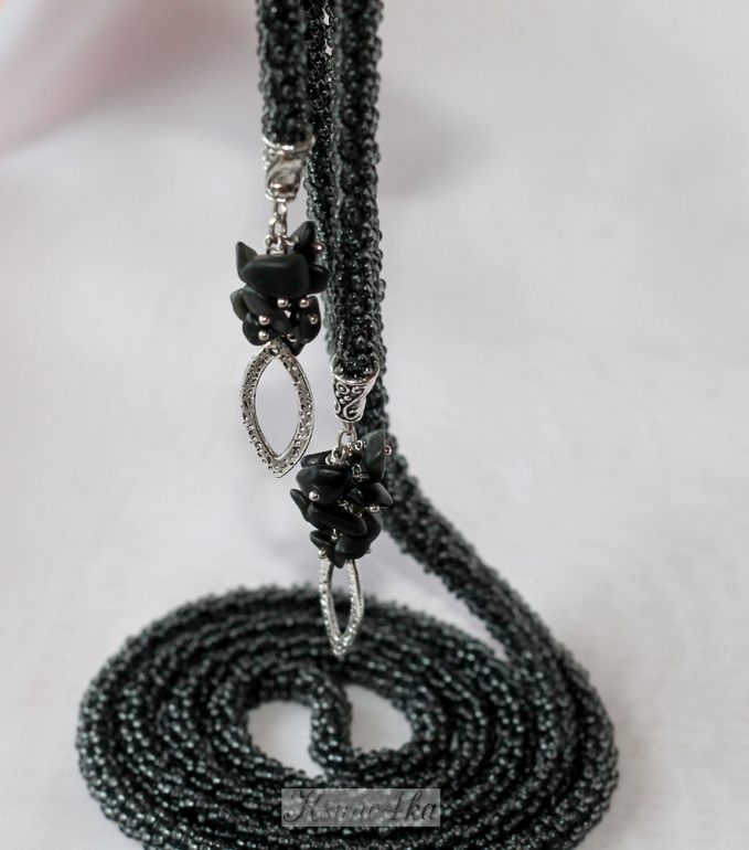 Сегодня у меня продолжение птичьей темы в коллекции моих жгутов. Лариат "Серая шейка" связался на одном дыхании и с большим удовольствием. Выполнен из чешского прозрачного бисера серого цвета, сколов обсидиана и фурнитуры под серебро.