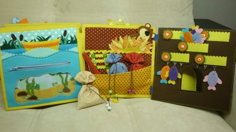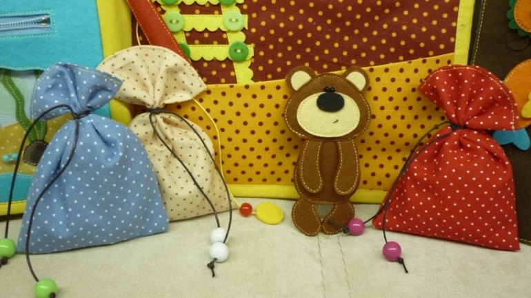 Мешочки различные на ощупь(один шуршит и легкий, другой мягкий, третий наполнен крупными бусинами и тяжелый)