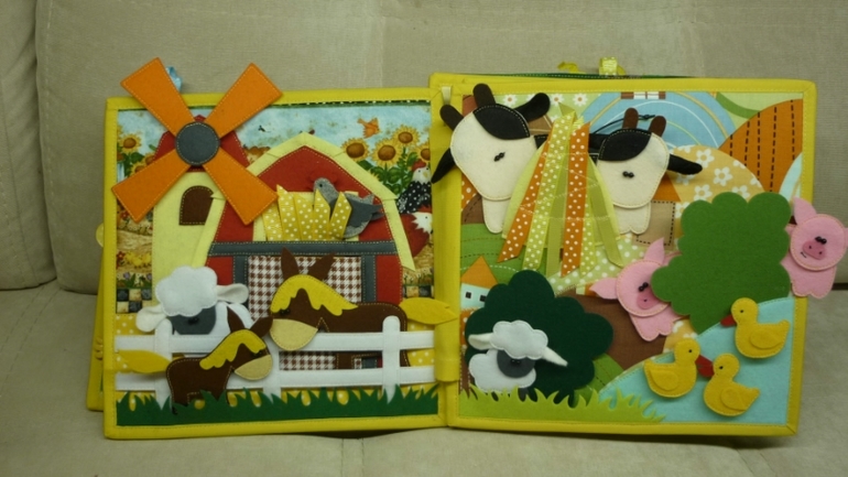 Красочная ферма с мамами и малышами).Лопасти мельницы вращаются.