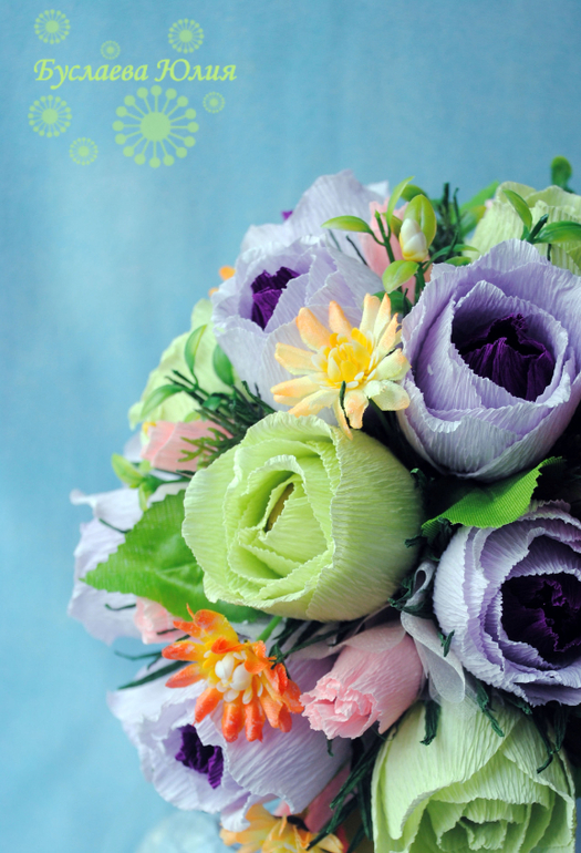 Переделала ручной букет "Снежная королева" (уже не актуально). Добавила зелени, розового и больше оранжевого. И получился совсем весенний букетик.