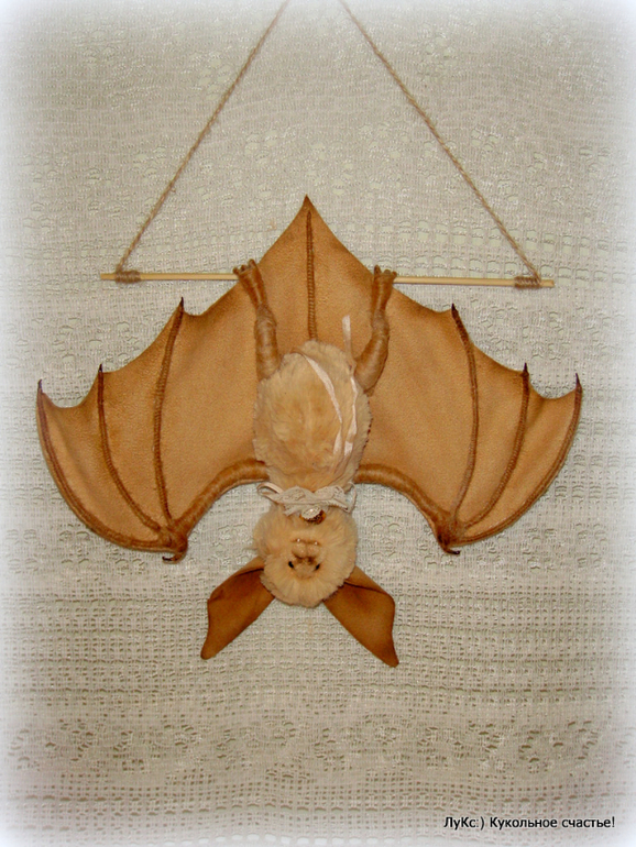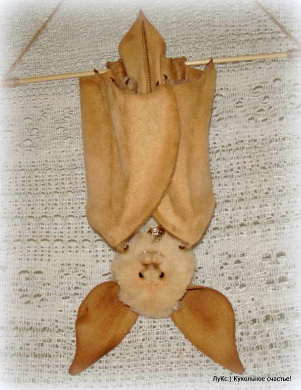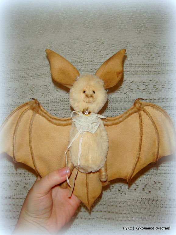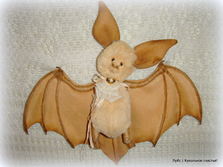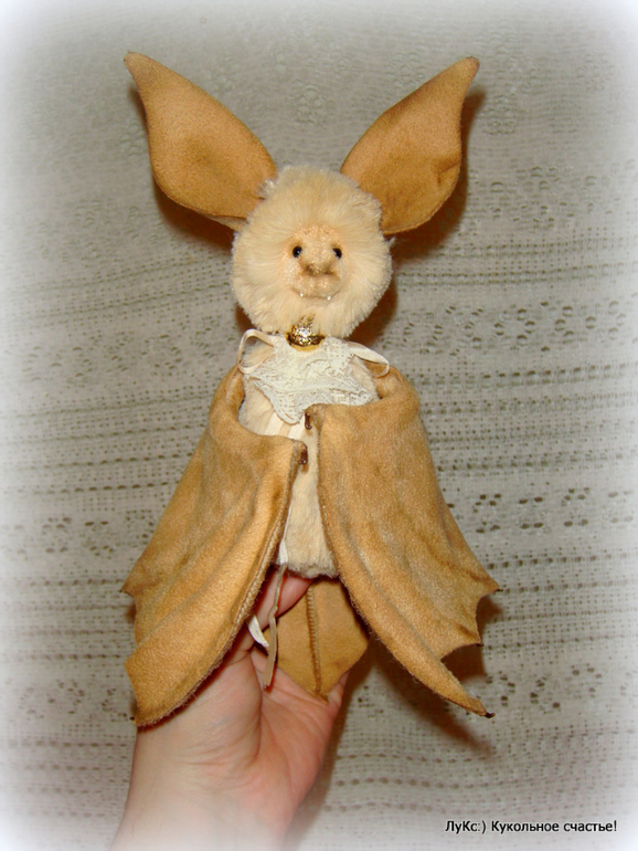 Тело из мягкой вискозы, голова на двойном шплинте, ноги-руки на проволочном каркасе, обмотаны шерстью, крылья и ухи из нежной замши (иск.), на ощупь как настоящие))) Жабо из старинного кружева и пуговицы. Тонирован маслом и пастелью.