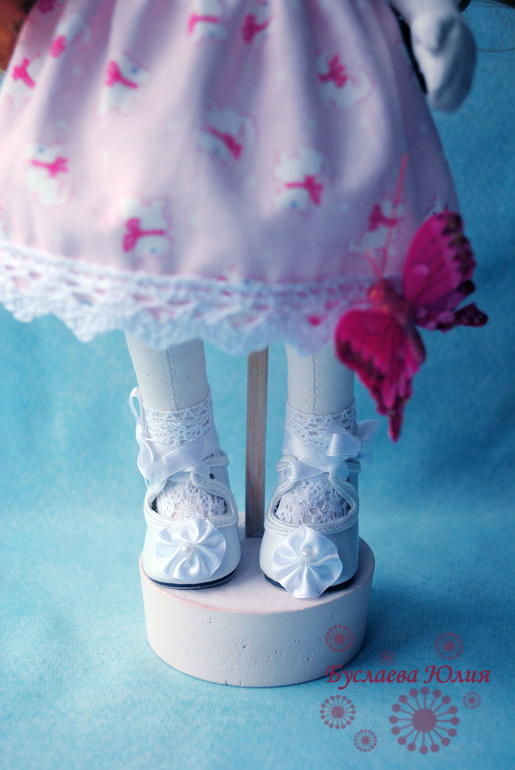 Захотелось сделать трогательную и нежную девочку с бабочками. Вот и получилась у меня рыжая Мишель. Одёжкой нагружать её не стала, поэтому одета она в нежно-розовое простое платьице.