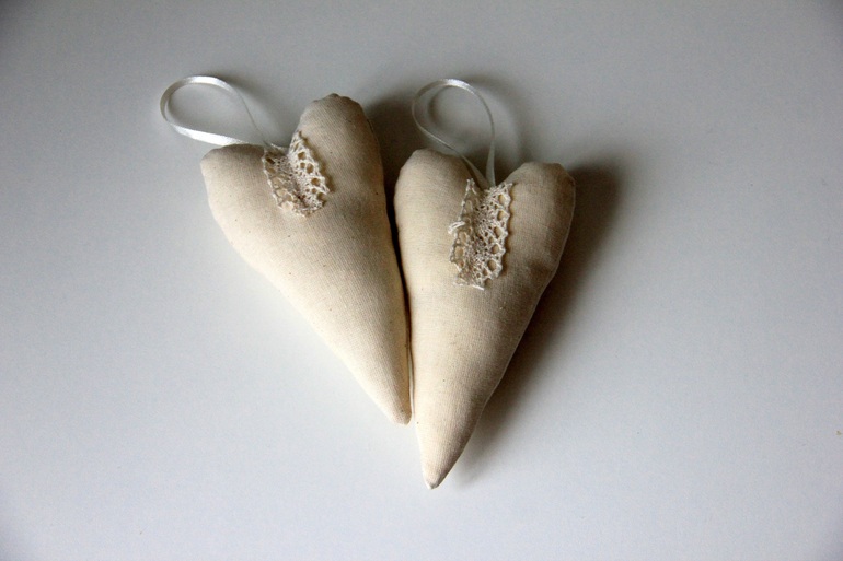 Один момент - я прошиваю по всему контуру, отверстие не оставляю. Вырезаю, вспарывателем (или ножничками) прорезаю на одной стороне отверстие и выворачиваю через него. Тогда сердечки получаются ровные. Набиваю плотно. Отверстие зашиваю, закрываю кружевом. Вот такие заготовочки у нас получатся: