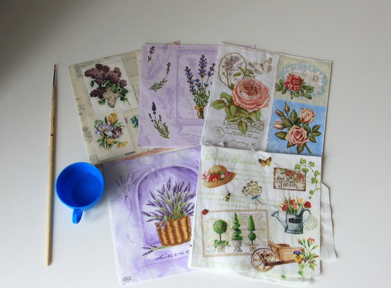 Теперь достаю салфеточки, выбираю мотив. Нужна будет вода и тонкая кисточка (нулевка например).